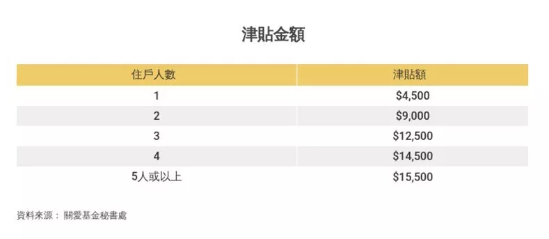 金额与首轮相同,一人住户金额为4,500元、二人住户9,000元等,申请过第一轮的住户将会收到由秘书处寄出的信件,只要按信件上回复即可获发津贴。