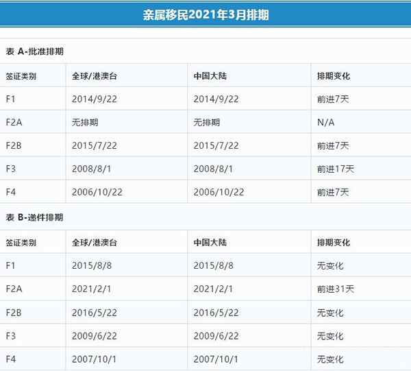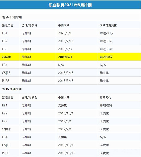 美国国务院(DOS)2月23日公布了2021年3月移民排期签证公告,EB-1大幅前进7个月,重回无排期时代,其他职业类移民排期小步前进,EB-5仍是原地踏步。具体排期进度和变化可以参照下表了解。