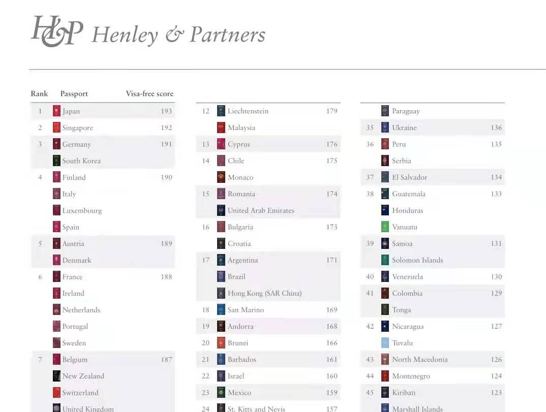 据Henley Passport Index(亨利护照指数)2021年护照排名最新发布,日本护照连续4年蝉联第一名,可免签旅行193个国家!新加坡排名第二,德国、韩国并列第三,排名前十名的多为欧洲国家。