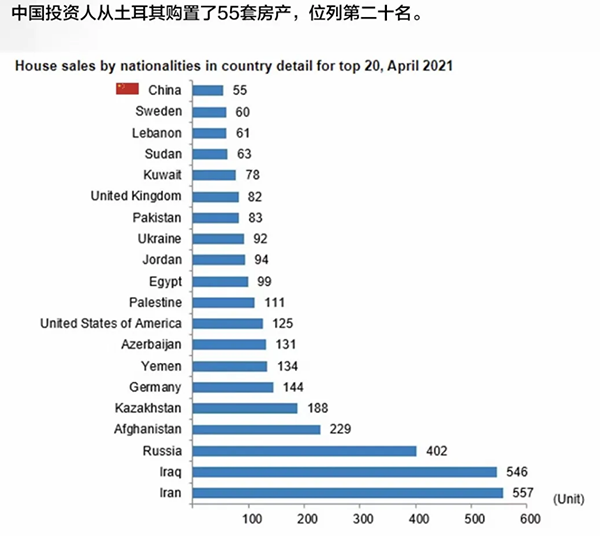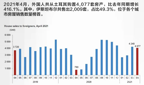2021年4月土耳其房产销售数据,4月土耳其售出95,863套房产,比去年同期增长124.1%;4月外国人共从土耳其购置4,077套房产,比去年同期增长416.1%;其中,中国投资人购置55套,位列国外买家国别第二十位!