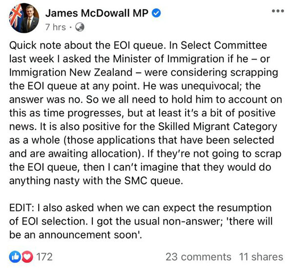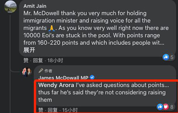 对于人们关心的EOI何时宣布重启的问题,James McDowall也问了移民部长。