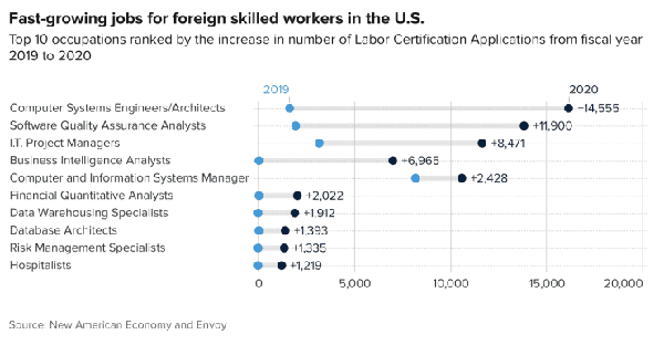 美国在计算机相关工作中过度依赖外国出生的人才。人口普查数据显示,移民在2019年占计算机劳动力的 25%,劳工部的数据显示,移民占更广泛劳动力的17.4% 。