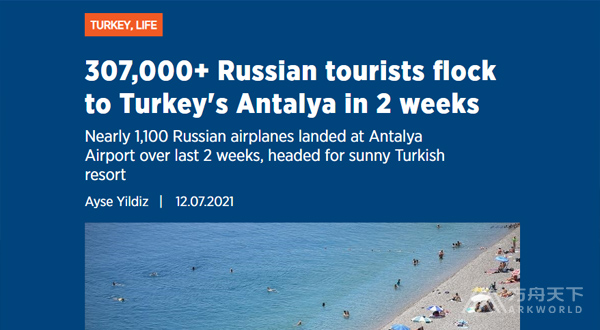 土耳其在重开边境以后,旅游业快速复苏。自7月1日起全面解除“禁足令”,目前已积极开放旅游业,表现出人意料!据土耳其官方阿纳多卢通讯社消息,2021年7月前两周,30.7万俄罗斯游客涌入地中海度假胜地土耳其海滨城市安塔利亚,开启了土耳其游客量暴增模式!