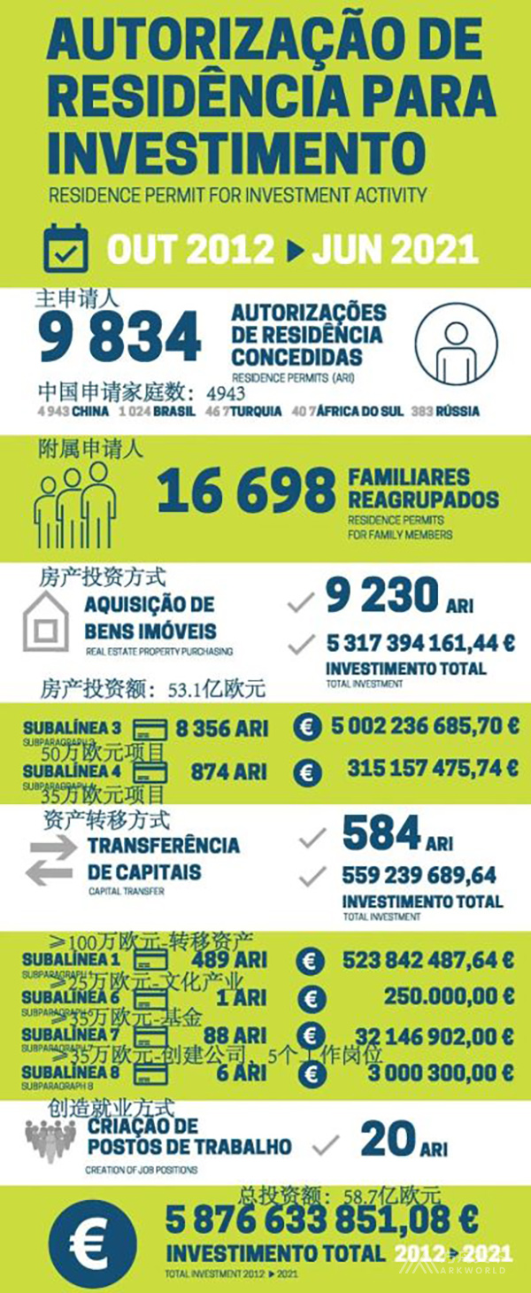 2021年根据葡萄牙移民局公布的黄金签证数据,葡萄牙移民热度依旧不减,葡萄牙自于2012年10月8日黄金居留许可政策开放,到今年已经步入第9个年头。截至2021年6月,葡萄牙黄金签证共签发9834位主申请人,总投资额高达58.7亿欧元。