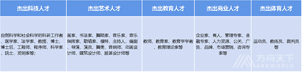 杰出人才,是指申请人在科学、艺术、商业教育或体育等领域,拥有高超的专业技能,并在其所属领域里属于占少数顶尖人才,且其才能和成就在其专业领域里获得国际国内的公认和推崇。