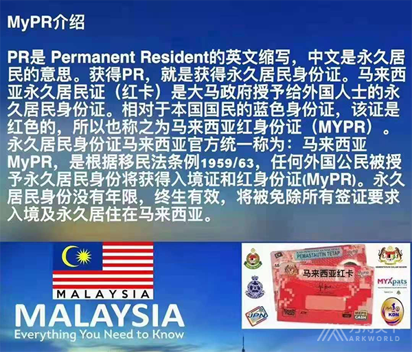马来西亚的移民基于1959/63年的《移民法》。任何获得永久居民身份的外国公民都将获得入境许可和红色身份证(MyPR)。 MyPR永久居民身份没有时间限制,并且终身有效。在马来西亚入境和永久居留将免除所有签证要求。红卡相当于马来西亚居民身份证!