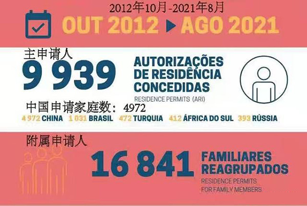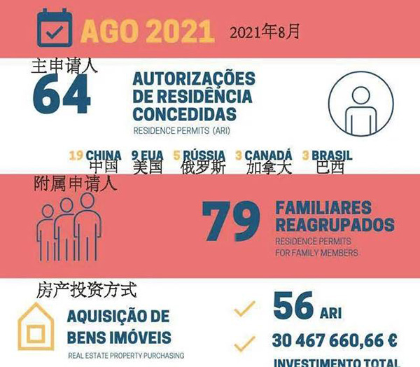 近日,葡萄牙移民局(SEF)官方最新发布关于“黄金居留许可计划“2021年8月份的投资数据。从数据上看,8月份共有64位主申请人及79位附属申请人获得了葡萄牙投资居留计划的许可,2021年共发放1359张居留卡。中国投资者数量共19位仍然高居榜首,排在后面的依次是美国9,俄罗斯5,加拿大3,巴西3;从总数据中看,排名前五的国家仍然保持不变,中国籍的主申请人占到4972位,占比约为50%。
