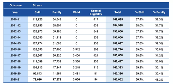 与过往财年相比,2020-21财年技术移民发放量进一步缩减,家庭签证发放量大增。