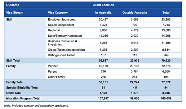 近日,澳洲移民局公布了2020-21财年的最新移民报告,截止2021年6月30日,该财年澳洲永久移民项目共发放了160,052个名额(原定配额为16万个)。其中,技术移民共发放了79,620个名额;家庭签证发放了77,372个名额,特别资格签证发放了54个名额,儿童类签证发放了3,006个名额。