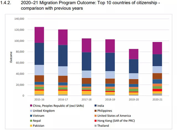 2020-21财年,中国大陆新移民的数量最多,成为澳大利亚第一移民来源国。